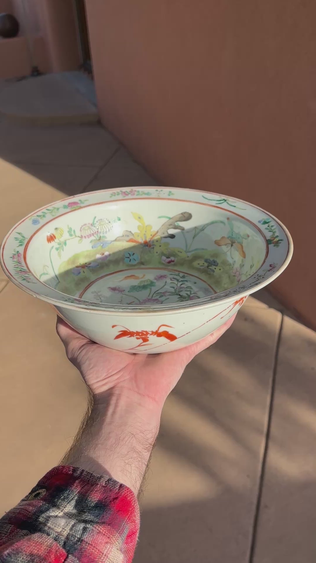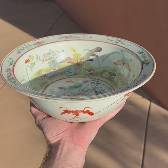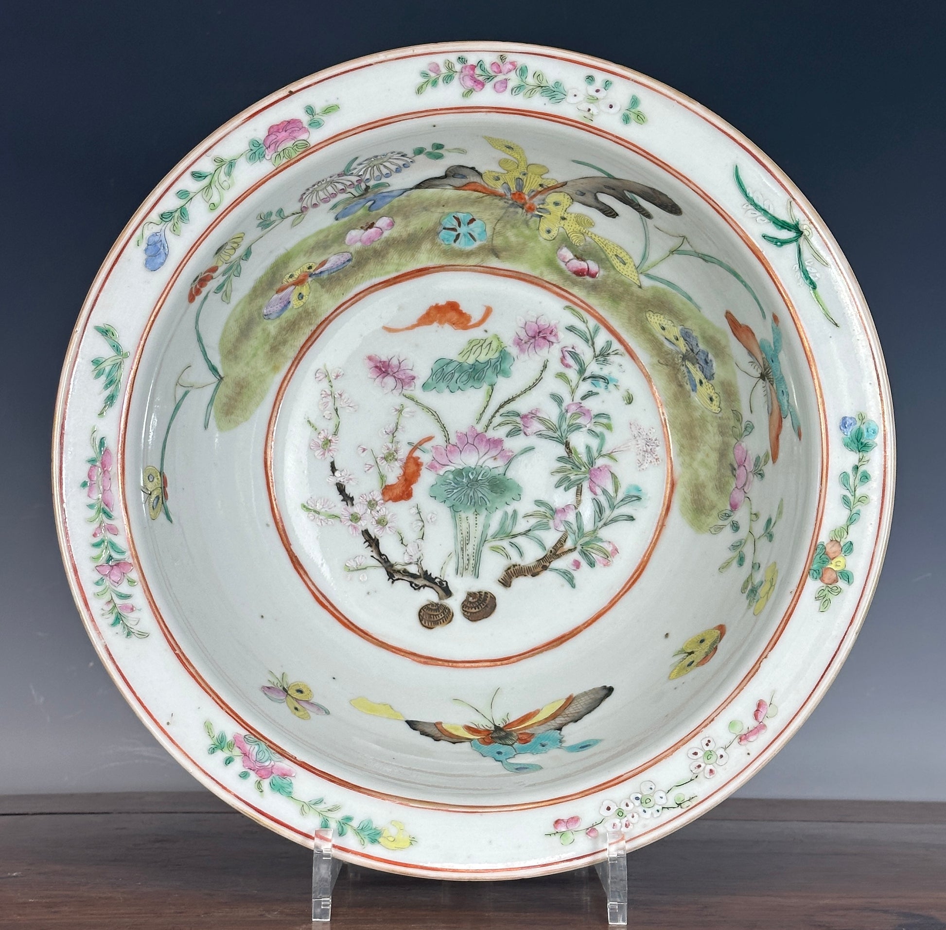 Antique Chinese Porcelain Basin Bowl “8 Butterflies” Bats Lotus Famille Rose 19th c Qing